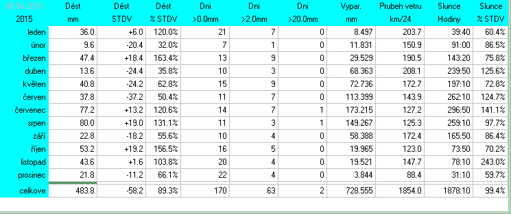 ** sluneční svit se dopočítává ze solární radiace (není k dispozici Heliograf)